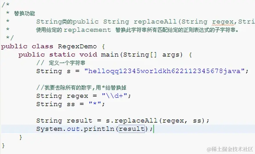 public String replaceAll(String regex, String replacement) 使用给定的 replacement 替换此字符串所有匹配给定的正则表达式的子字符串。