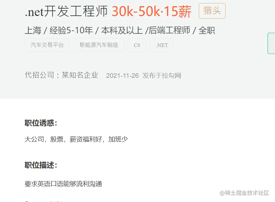 2.拉钩上的.Net开发工程师——车企,5-10年年工作经验,30k-50k*15薪