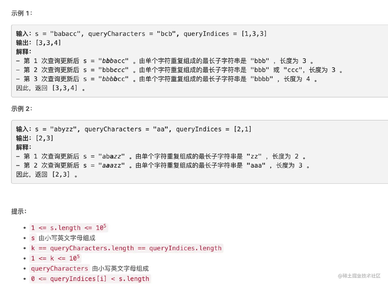 返回一个长度为 k 的数组 lengths ,其中 lengths[i] 是在执行第 i 个查询 之后 s 中仅由 单个字符重复 组成的 最长子字符串 的 长度 。