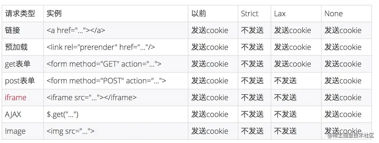 从上图可以看出,对大部分 web 应用而言,Post 表单,iframe,AJAX,Image 这四种情况从以前的跨站会发送三方 Cookie,变成了不发送。