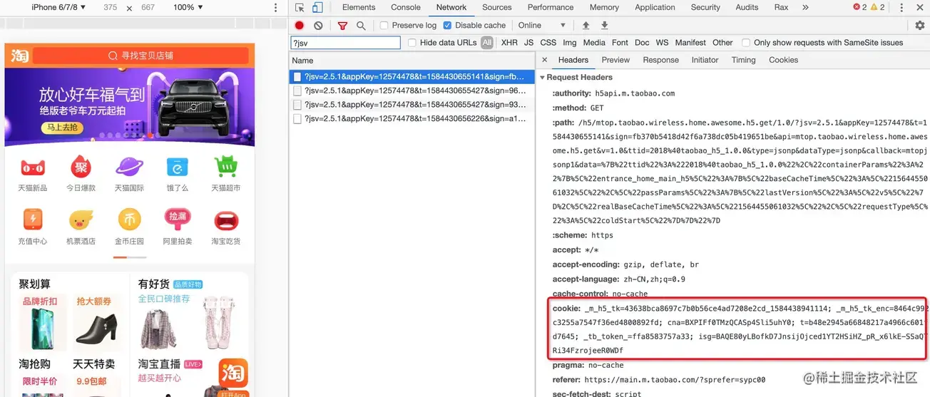 我们刷新一遍页面,再看下这个请求,可以在 Request Headers 看到 cookie 字段: