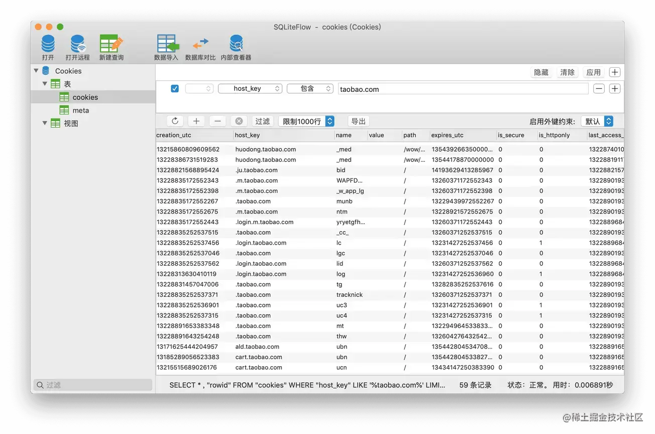 尽管我们在浏览器里查看到了 Cookie,这并不意味着 Cookie 文件只是存放在浏览器里的。实际上,Cookies 相关的内容还可以存在本地文件里,就比如说 Mac 下的 Chrome,存放目录就是 ~/Library/Application Support/Google/Chrome/Default,里面会有一个名为 Cookies 的数据库文件,你可以使用 sqlite 软件打开它: