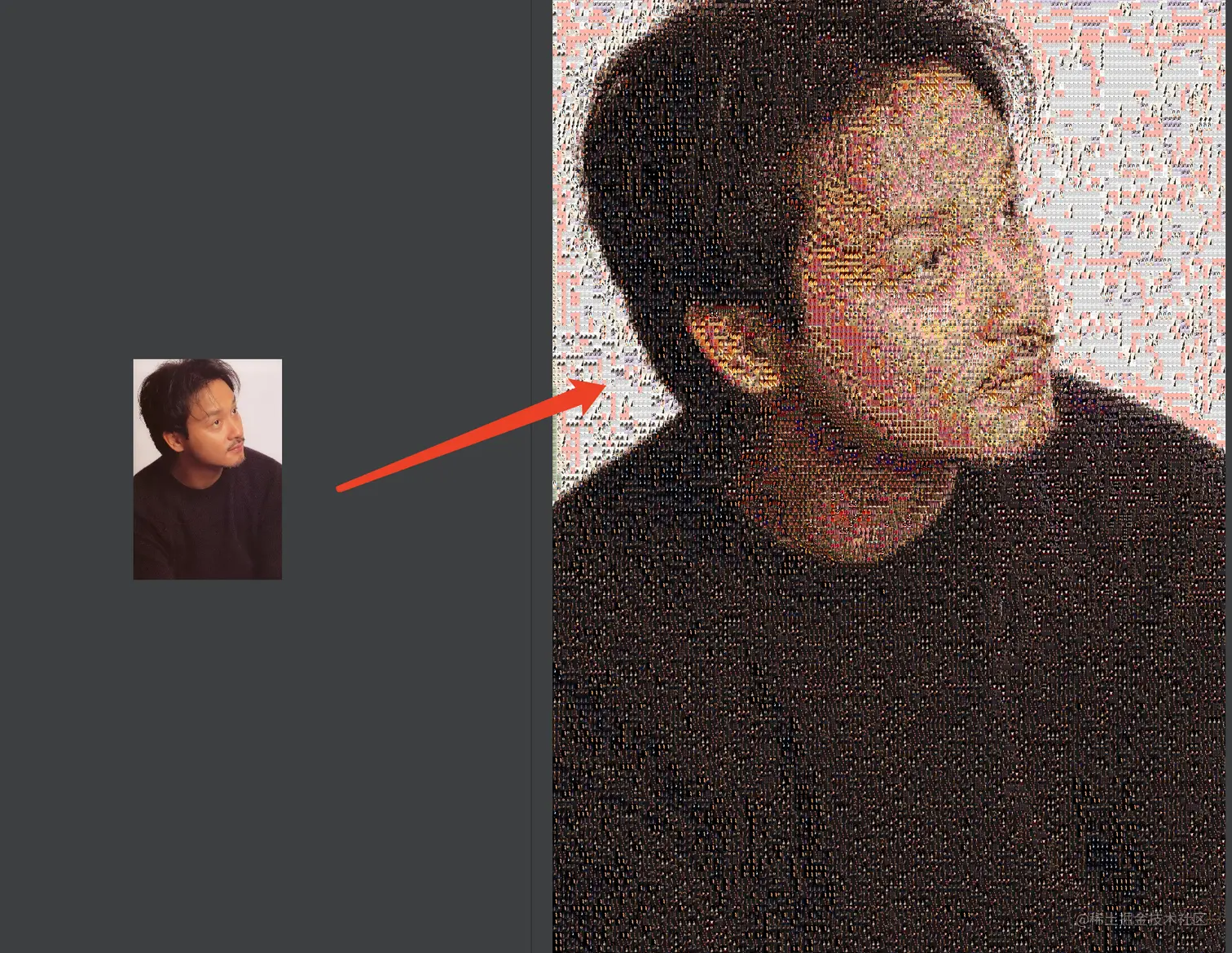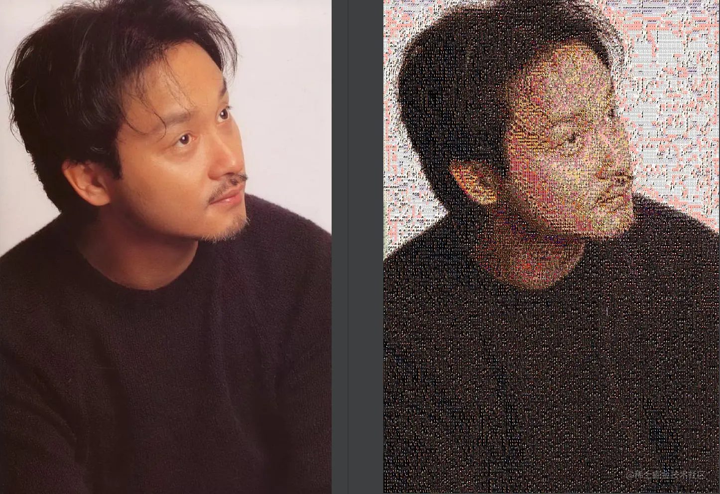 一张图片要变成马赛克照片,实际上就是将图片切割成n份,每一份的去搜索相似的图片颜色相近,结构相近的,然后替换即可,以下我利用超级偶像张国荣来演示