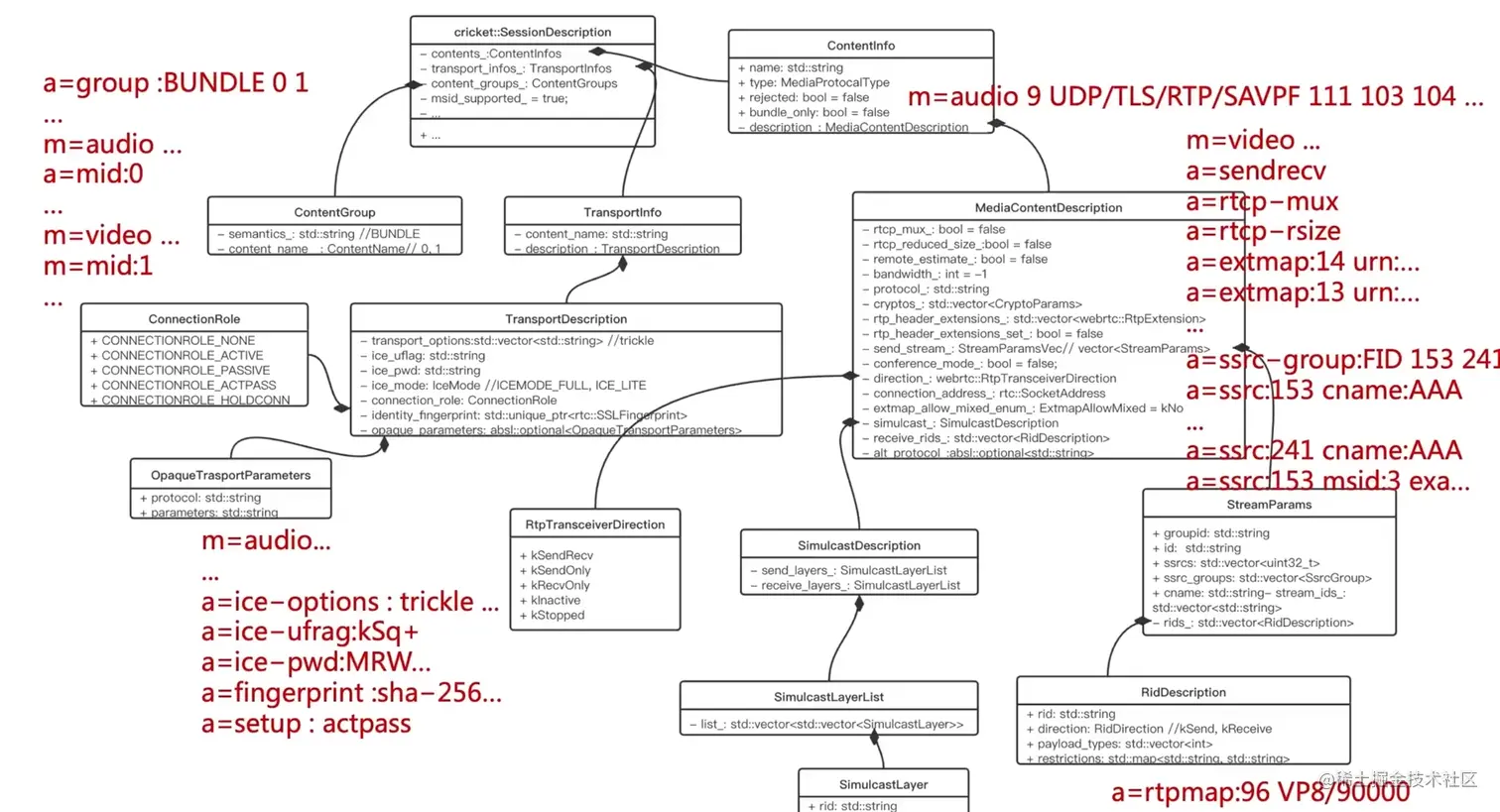 WebRTC中的SDP类结构 AGoodrMe 2022-03-22 198 阅读1分钟 SDP内容分类(按功能分类) webrtc对SDP的分类(分为: 内容组/传输/内容) webrtc中的SDP类结构