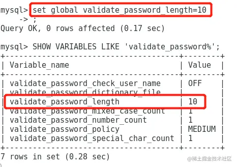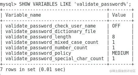 | validate_password_policy MEDIUM //密码强度(LOW、MEDIUM、STRONG)默认为MEDIUM