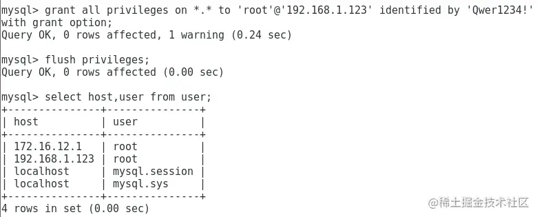 如果想要添加多个远程用户的话可以使用一下命令,添加多条策略