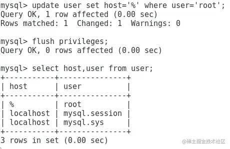update user set host='%' where user='root'; //修改host列,“%”的话是开启所有用户的远程连接,如果想要开启某一个IP就在host后面改成IP就可以