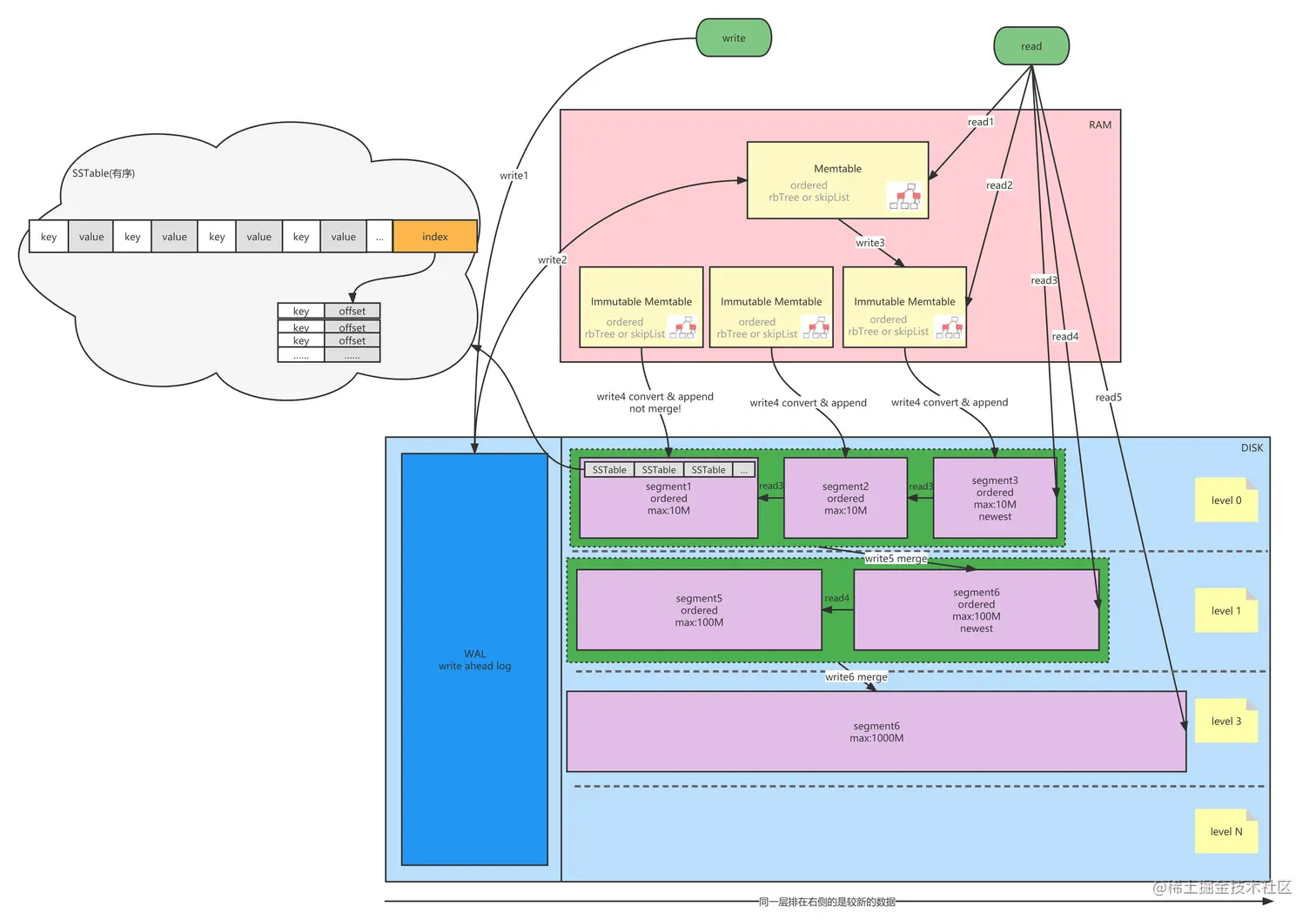 write5、write6…:因为不确定下层是否有被删除的key,到最后一层merge时才真正删除
