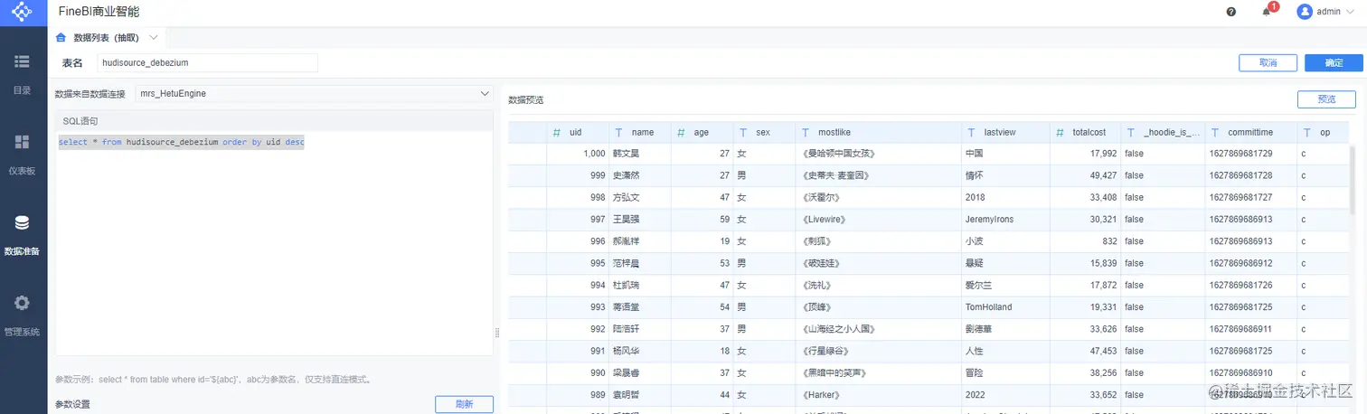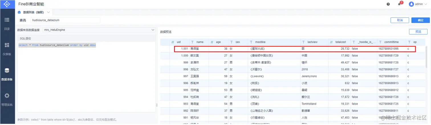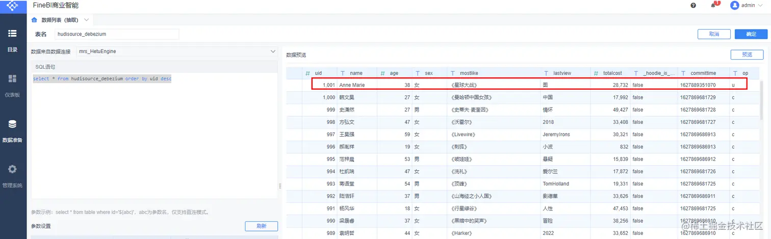 更改操作: UPDATE hudi.hudisource SET uname=‘Anne Marie’ WHERE uid=1001;