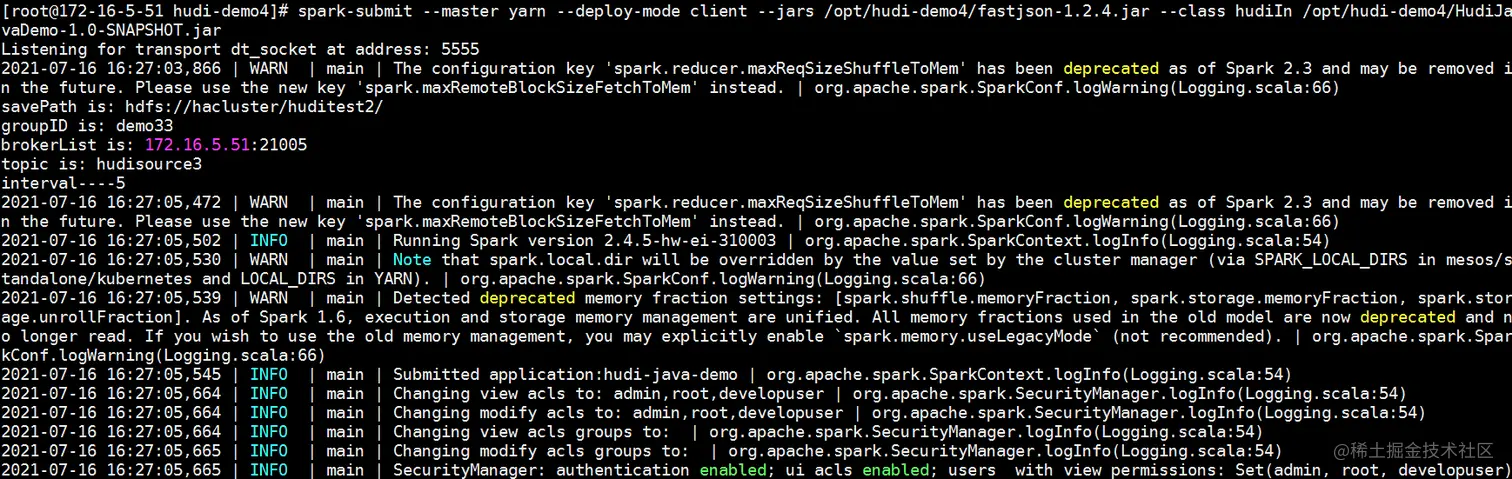 spark-submit --master yarn --deploy-mode client --jars /opt/hudi-demo4/fastjson-1.2.4.jar --class hudiIn /opt/hudi-demo4/HudiJavaDemo-1.0-SNAPSHOT.jar