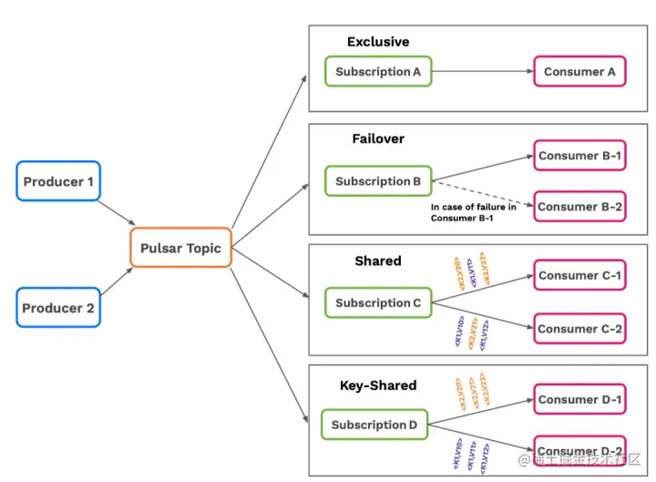 - 键共享订阅:可以将多个消费者附加到订阅上,并且每个消费者都分配有一组唯一的键。该消费者负责处理分配给它的一组键。如果失败,将为另一个消费者分配该组键。