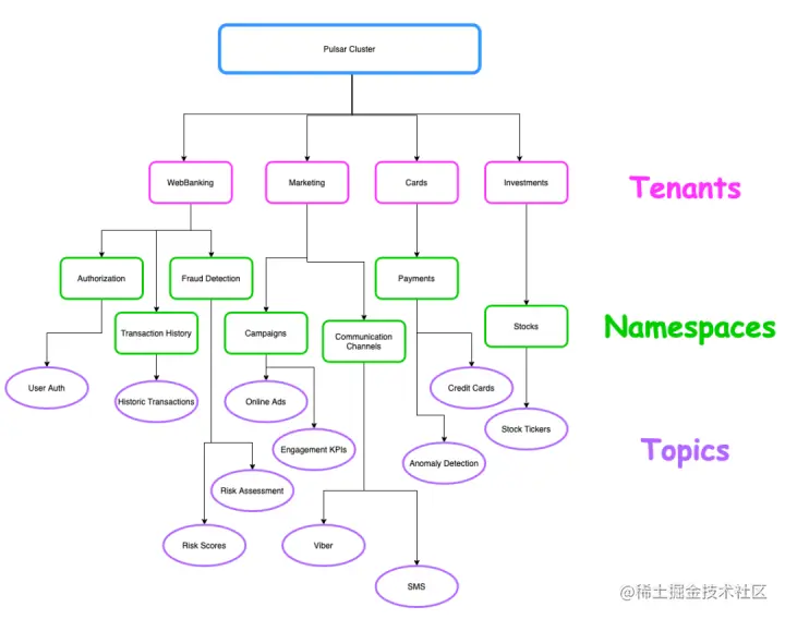 - 多租户:Apache Pulsar 从一开始就被设计成一个多租户系统。您可以将多租户视为不同的用户组,每个用户组都在自己的隔离环境中运行。Pulsar 的逻辑架构由租户、命名空间和主题组成。命名空间是租户内主题的逻辑分组。您可以使用定义的层次结构轻松映射组织的需求,并提供隔离、身份验证、授权、配额以及在命名空间和主题级别应用不同的策略。电子商务业务的多租户示例如下,将 WebBanking 和 Marketing 等不同部门作为租户,然后这些部门成员可以在租户内进行操作。