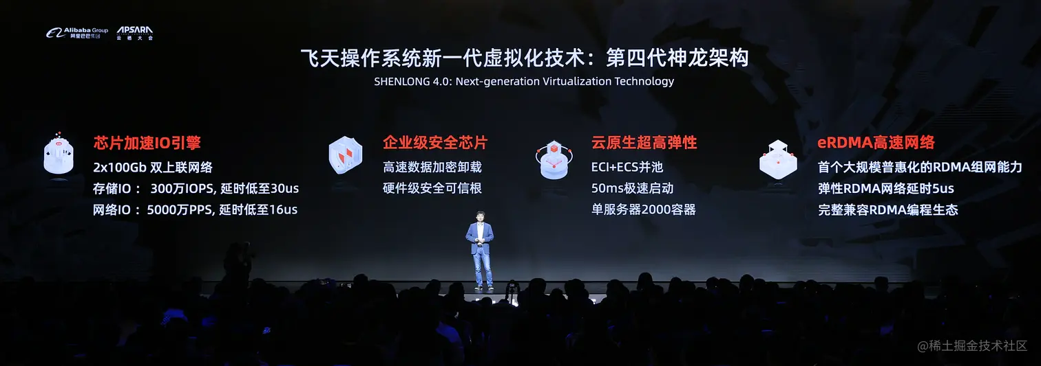 10月20日,2021年杭州云栖大会上,阿里云发布第四代神龙架构。相比上一代,第四代神龙架构基础性能全面提升,存储IOPS提升300%、网络PPS提升100%、网络延迟降低80%,同时升级至全新的eRDMA网络架构,是业界首个大规模弹性RDMA加速能力,再次实现了性能的跃升。