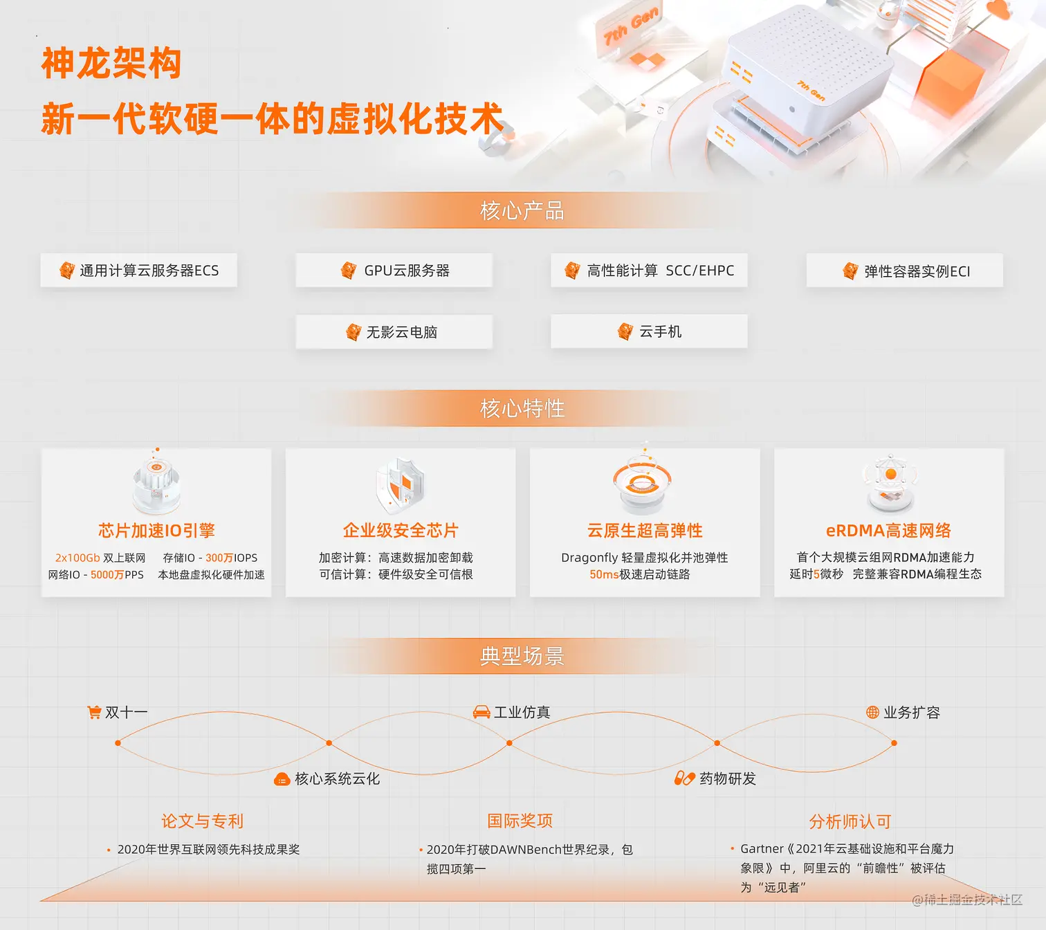 神龙架构是阿里云自研的新一代软硬一体虚拟化技术,将虚拟化卸载专用芯片进行处理,并进行硬件加速IO引擎,具有超高性能和弹性,是云原生的最佳载体;安全方面,最新一代神龙搭载企业级安全芯片,配备可信计算与加密计算能力,实现系统可信防篡改与数据的可用不可见。其中,第四代神龙架构独有的弹性RDMA加速能力,将让广大互联网应用受益。