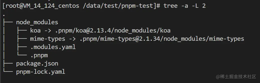 展开项目node_modules,可以看到仅仅只有koa以及mime-types(因为包名命中了默认配置,所以被提升到顶层)被安装顶层,并且顶层包都是软链到 /node_modules/.pnpm/ ,也就说实际上所有包都被平铺到.pnpm目录中