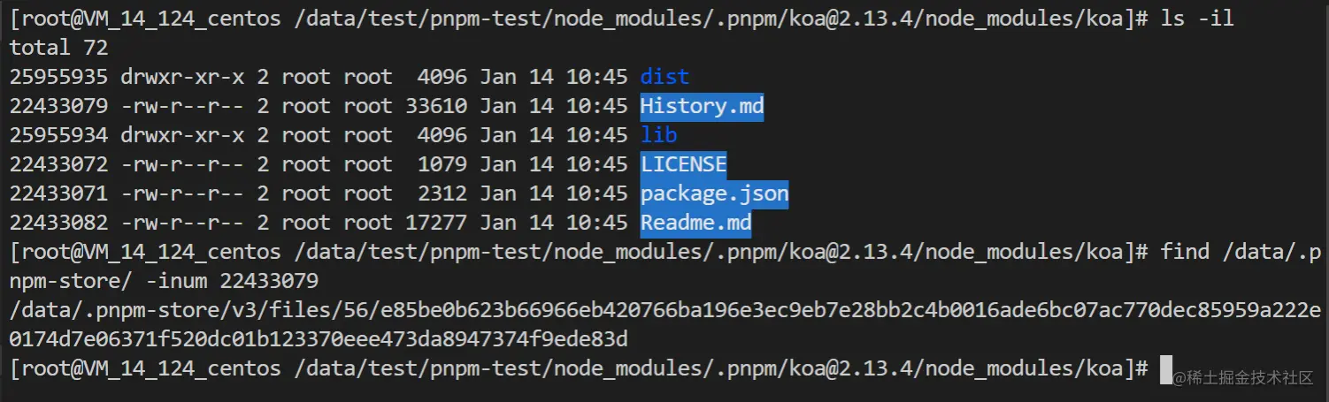 进入到.pnpm目录中,由此就可以知道项目依赖实际上是放在 .pnpm/{包名@版本}/node_modules/, 然后通过hard link到全局的store目录中