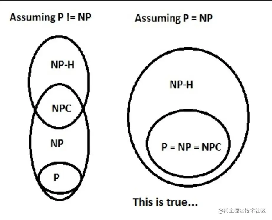 如果P=NP,那么所有的NPC问题都可以在多项式时间内解决,只是目前我们还没有找到解法。如果,那么所有的 NPC问题应该单成一类,从P中划分出去。 下面的维恩图表示了这两种情况: