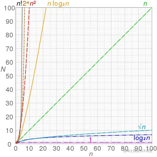 对于其他时间-规模曲线,也会有同样的特征,于是我们就有了算法复杂度的分类,比如 ,
