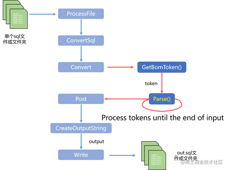 当单个SQL文件或者含有多个SQL文件的文件夹被-in参数所指定,就会经过ProcessFile处理文件。文件内容被ConvertSql预转换为数据流传入Convert,其中GetBomToken()函数将数据依照token语法树转换后传入Parse()函数。Parse()函数会根据映射进行批量处理直到token被处理完成,经过Post后由CreateOutputString处理为输出流,最后由Write写入文件或文件夹。在原有文件名的基础上默认加上_out,亦可自定义输出文件。