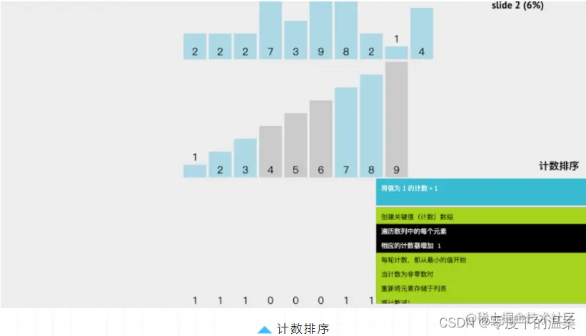 「计数排序」是一种稳定的排序算法。「基本思想:」使用一个额外的数组C,其中第i个元素是待排序数组A中值等于i的元素的个数。然后根据数组C来将A中的元素排到正确的位置。它只能对整数进行排序。