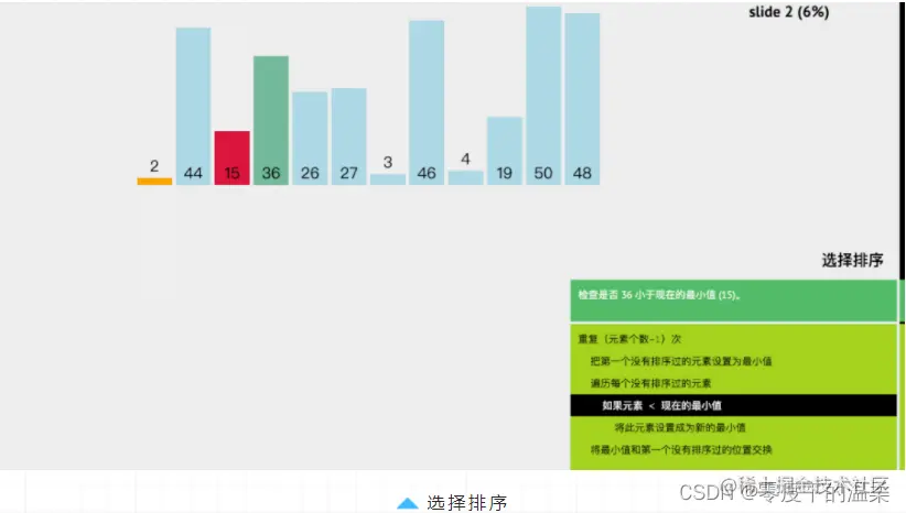 「选择排序」是一种简单直观的排序算法,「基本思想:」首先在待排序序列中选出最小或最大值,存放在排序序列起始位置,然后再从剩余未排序元素中继续寻找最小或最大元素,放到已排序序列末尾。以此类推,直到所有元素均排序完毕。