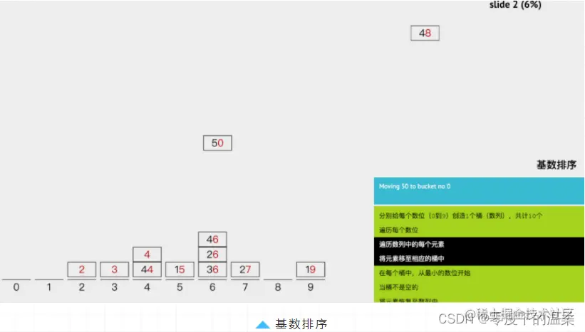 「基数排序」也是非比较的排序算法,「基本思想:」按照低位先排序,然后收集;再按照高位排序,然后再收集;依次类推,直到最高位。有时候有些属性是有优先级顺序的,先按低优先级排序,再按高优先级排序。最后的次序就是高优先级高的在前,高优先级相同的低优先级高的在前。基数排序基于分别排序,分别收集,所以是稳定的。