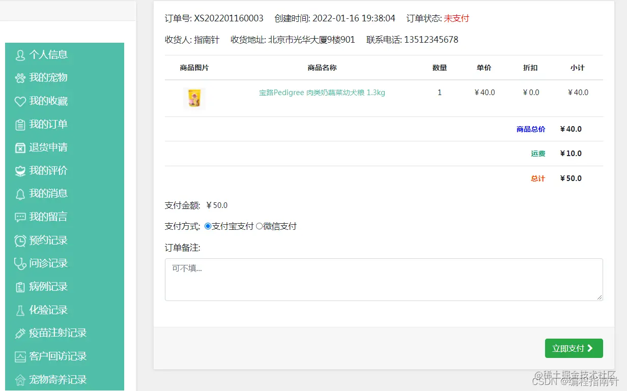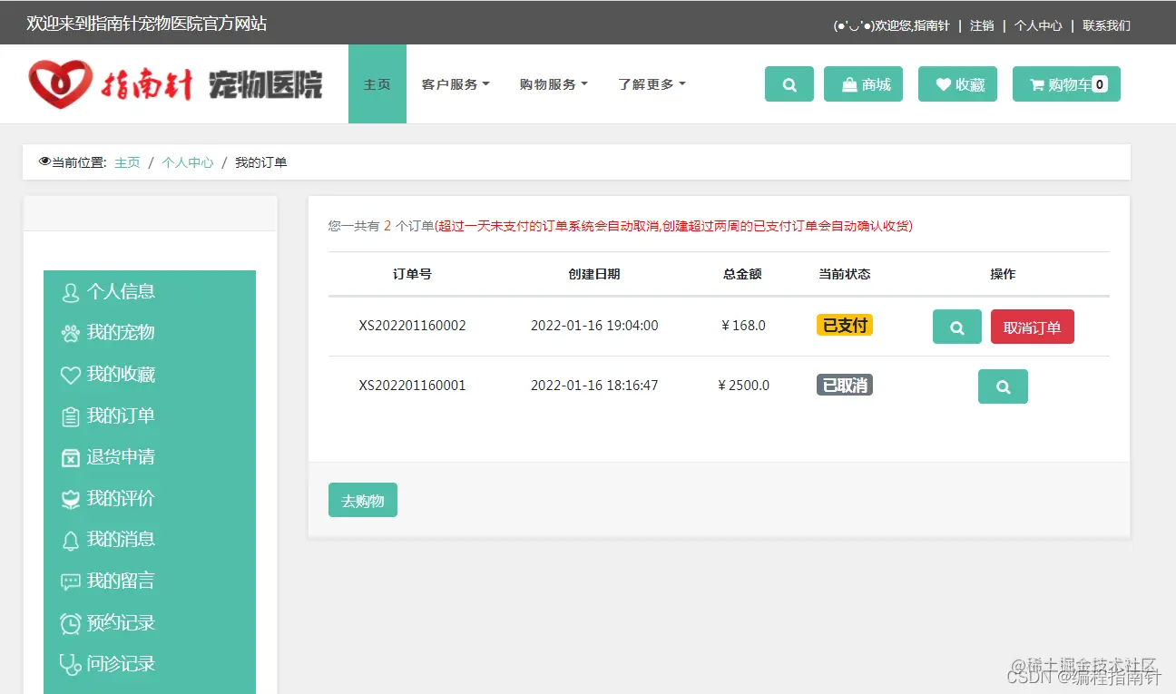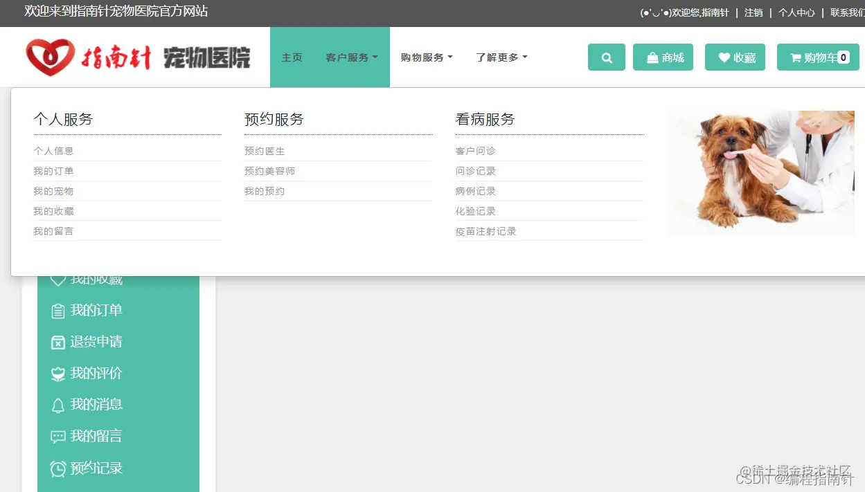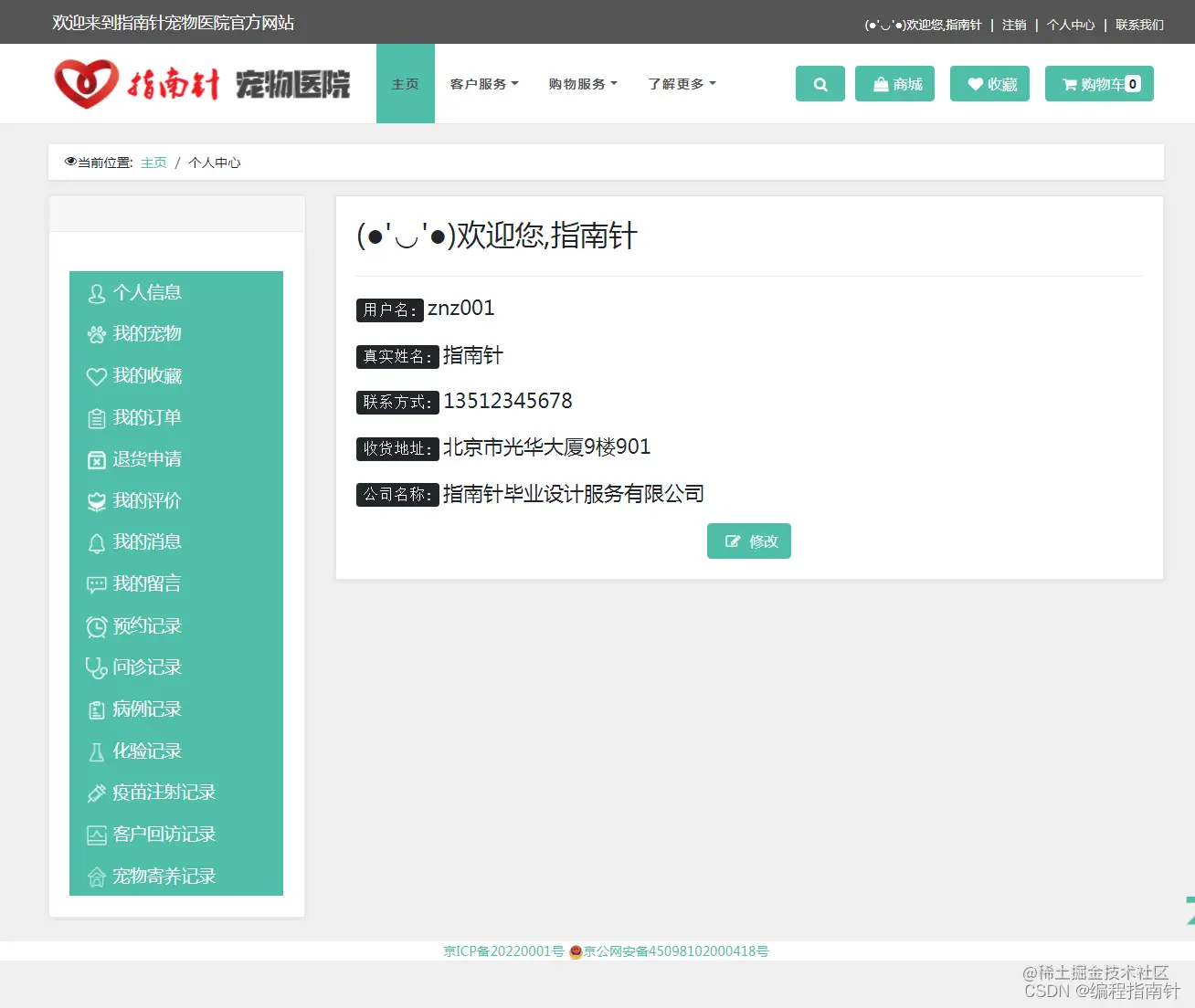 #### 已注册用户 注册用户可以修改个人信息和宠物信息,发布预约单(预约医生和美容师),在医院的商城购物,收藏商品,给官方留言,查看与自己相关的记录信息,如:病例记录、预约记录、问诊记录、订单记录等,注销退出系统。