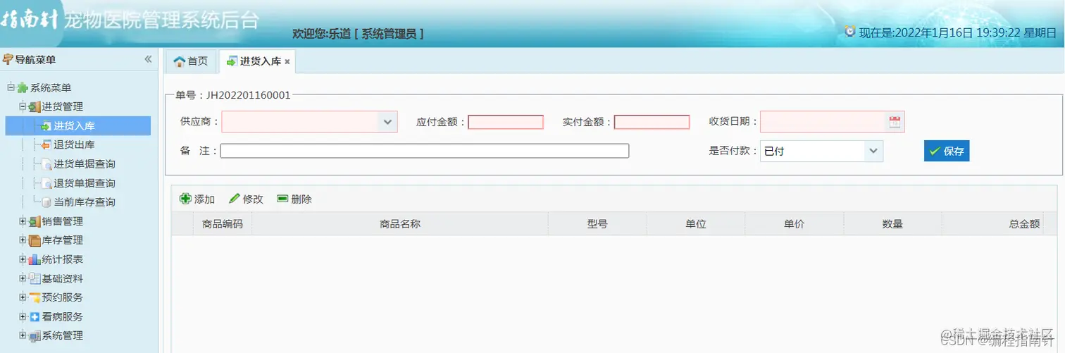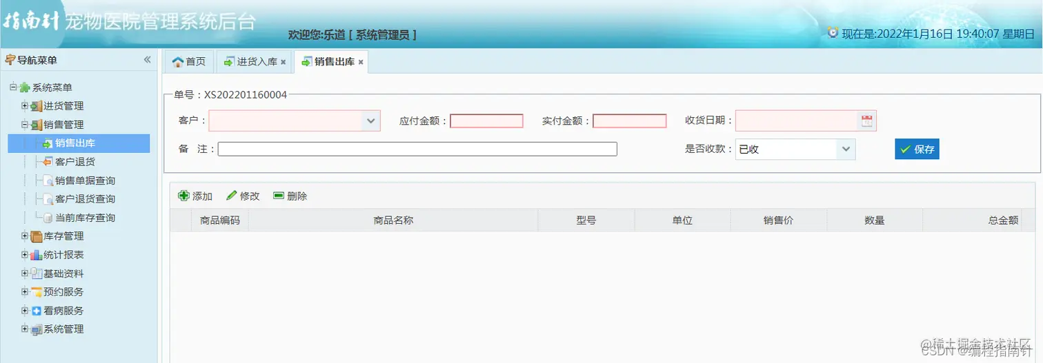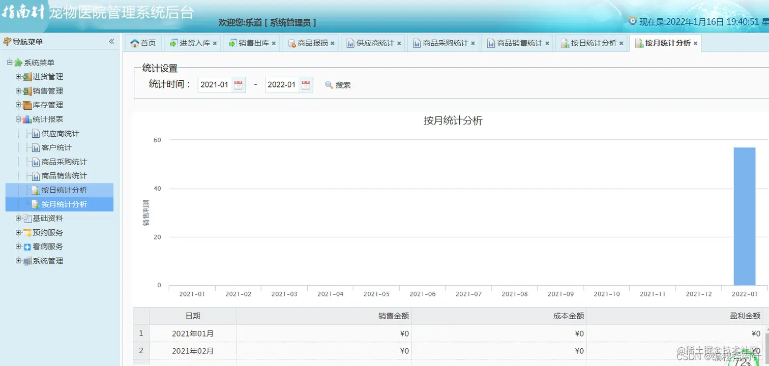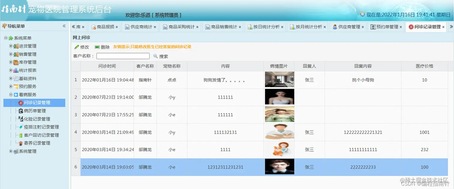 #### 业务管理员 业务管理员具有进货管理(包括进货入库、退货出库、进货单据查询、退货单据查询以及当前库存查询)、销售管理(包括销售出库、客户退货入库、销售单据查询、退货单据查询)、库存管理(包括商品报损、商品报溢、库存报警、报损报溢记录查询)、查看统计数据(供应商进退货单统计、客户进退货单统计、按日统计销售利润、按月统计销售利润)、供应商管理、客户管理、商品管理、期初库存管理、前台轮播图管理、设备类型管理、设备管理、设备使用管理、设备使用记录管理、文章类型管理、文章管理、客户留言管理、医院用品管理、医院用品出入库管理、医院用品出入库记录管理、客户消息管理、客户订单处理、客户预约单管理、客户问诊记录管理、病历单管理、化验记录管理、疫苗注射记录管理、客户回访记录管理、寄养记录管理、修改密码、安全退出系统。