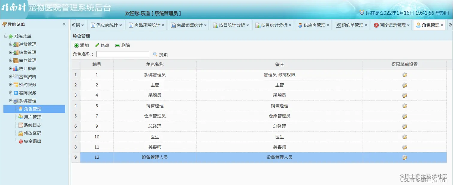 具体的角色就不再一一展示了,不同的用户可以根据后台设定不同的操作权限,整体系统的功能非常强大,几乎包含了宠物商城、宠物看病就医、宠物进销存等管理的所有功能模块,可以根据自己的需求选择一部分功能进行使用!