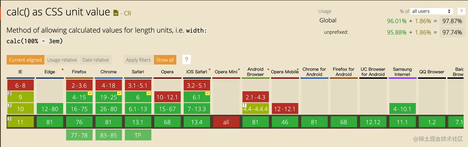 注意: +和-运算符在运算符和值之间需要一个空格。例如,它将被calc(50% -8px)解释为百分比,后跟负像素长度。只有在-到8px之间有空格时,才可以正确减法:calc(50% - 8px) 空格在乘法或除法中不起作用,但建议阅读时要注意。