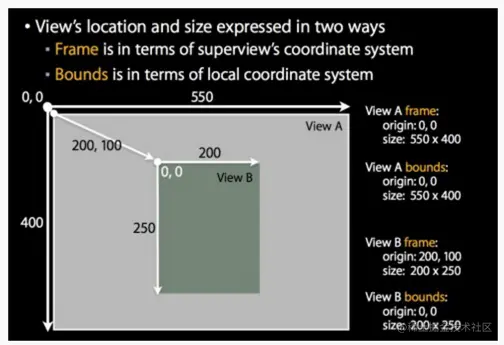bounds:该view在本地坐标系统中的位置和大小。(参照点是,本地坐标系统,就相当于ViewB自己的坐标系统,以0,0点为起点)。