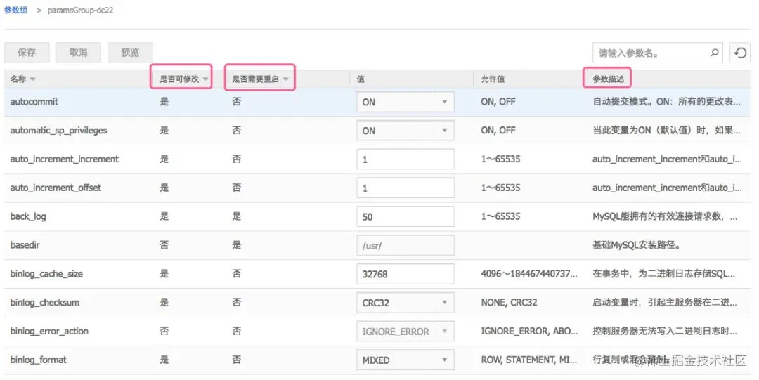 面上“是否可修改栏”栏显示为“是”的参数,表示这个参数可以修改。“是否需要重启”栏显示为“是”的参数,表示这个参数修改后,需要重启RDS数据库才能生效,显示为“否”的参数可以立即生效,不需要重启。