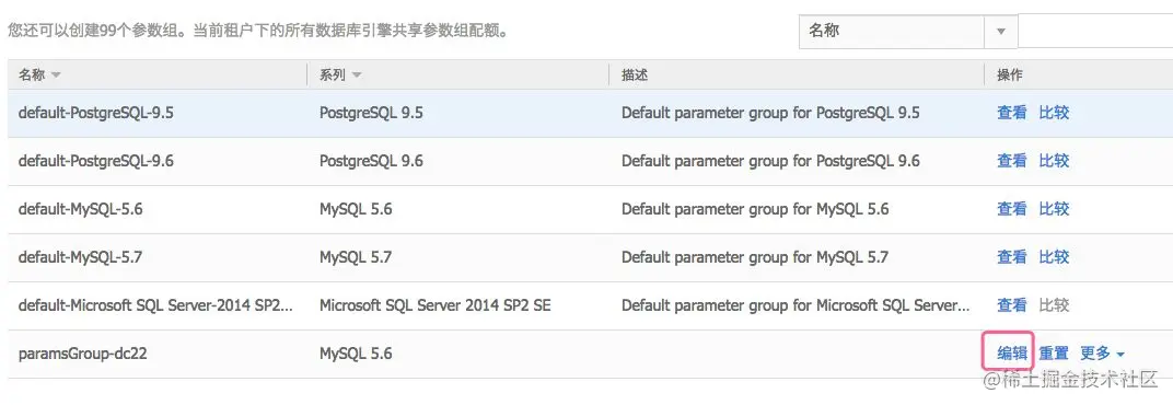 参数组中已经有MySQL、PostgreSQL和SQLServer数据库的默认参数组。默认参数组不能修改,因此我们需要创建一个新的参数组。