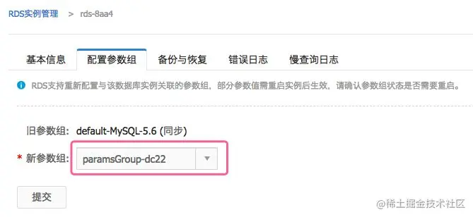 “配置参数组”页面,在“新参数组”下拉中选择第二步创建的参数组,再点击提交。