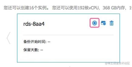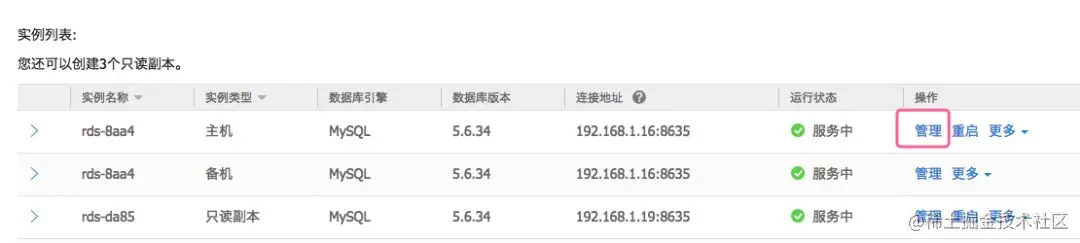 点击进入RDS实例管理,找到正在使用RDS实例。点击主实例行所在的“管理按钮”