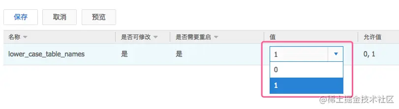 对应到文章开头提到的设置库表大小写不敏感,需要修改lower_case_table_names参数由0改为1。可以在右上角的搜索框中输入lower_case_table_names,快速找到这个参数。点击值这一列,设置lower_case_table_names这个参数为1,然后点击保存按钮使配置生效。
