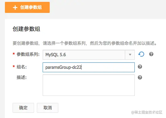 点击页面上方的“创建参数组”按钮,然后选择需要创建的数据库型号及版本。本例中使用的数据库为MySQL 5.6,因此参数组系列要选择 MySQL 5.6。点击确定完成创建。