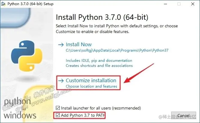 3.勾选【Add Python 3.7 to PATH】,点击【Customize installation】。