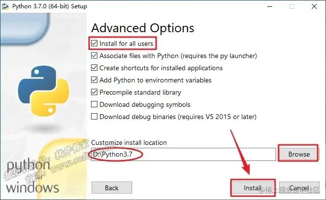 5.勾选【Install for all users】,点击【Browse】可更改安装位置(建议不要安装在C盘,可以在D盘或其它磁盘下新建一个“Python3.7”文件夹。注:安装路径中不能有中文),点击【Install】。