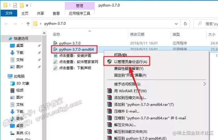 2.打开解压后的文件夹,根据自己电脑操作系统的位数打开对应的程序:鼠标右击【python-3.7.0-amd64】(64位)或【python-3.7.0】(32位)选择【以管理员身份运行】。