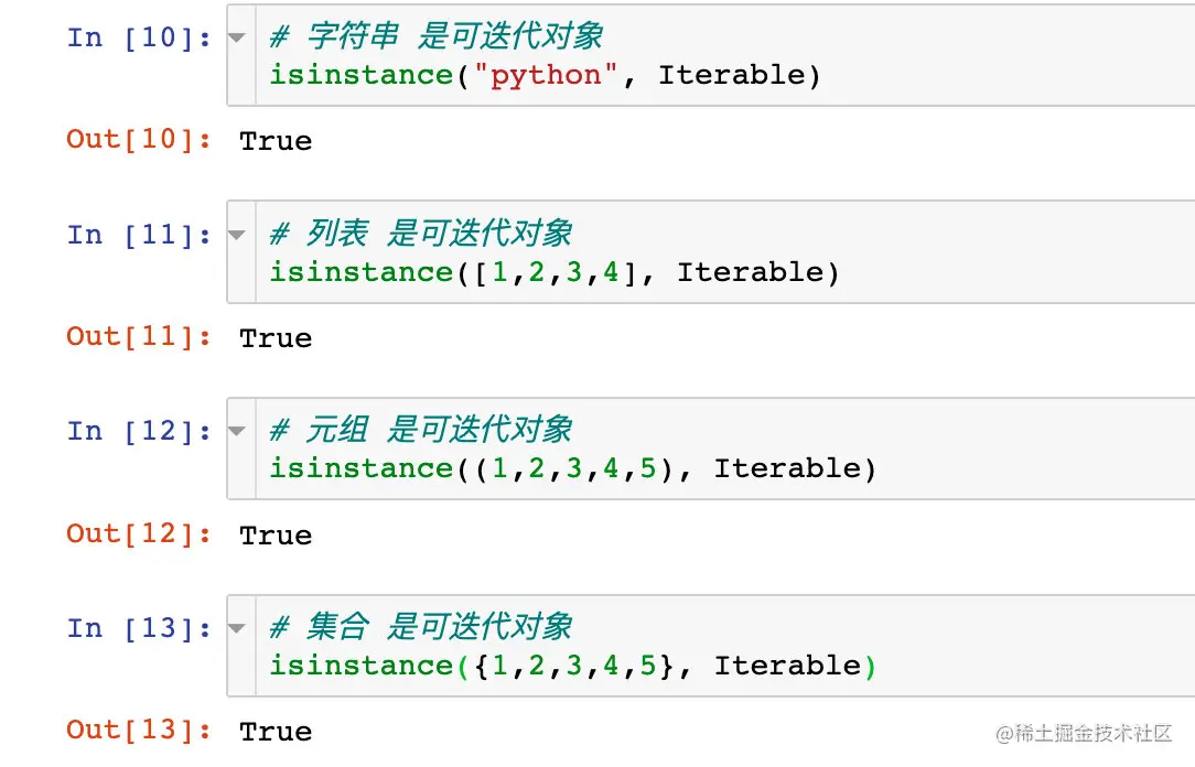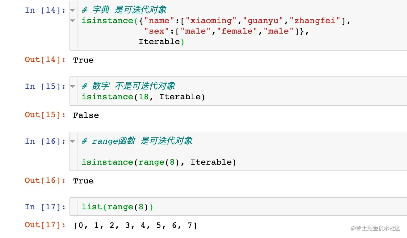 在Python中,我们使用 isinstance()函数 判断python对象是否可迭代: