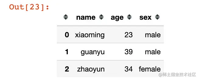 MultiIndex([('xiaoming', 23, 'male'), ( 'guanyu', 39, 'male'), ( 'zhaoyun', 34, 'female')],