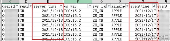 一位开发者向我们提出自己在创建数据任务后,发现错误获取了所选日期前一天的数据。例如下图所示,导出的2021年12月18日的数据报表中eventtime包含了12月17日发生的事件: