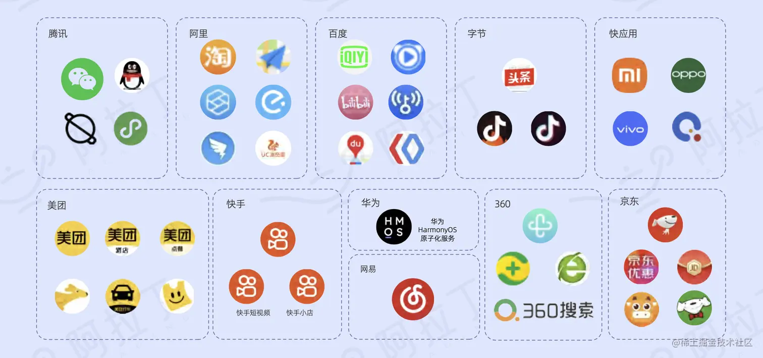 目前大型互联网巨头几乎全都投入到小程序生态的建设中,包括腾讯、阿里、百度、字节、快应用、美团、快手、网易、华为、360和京东这十系平台。
