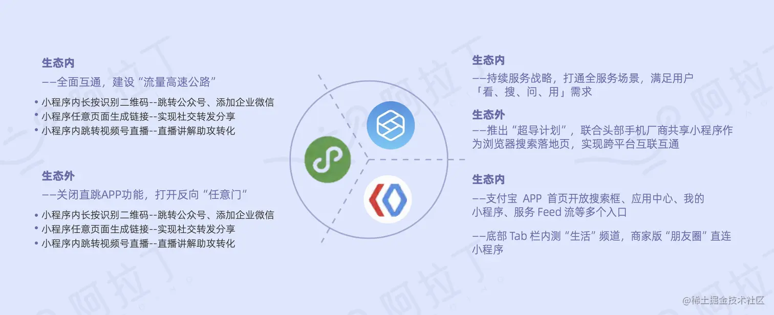 如果将当前主流的小程序生态进行对比,也能发现一些差异化的特色,各大平台基本都是根据自身平台基因来定位小程序生态的使命。