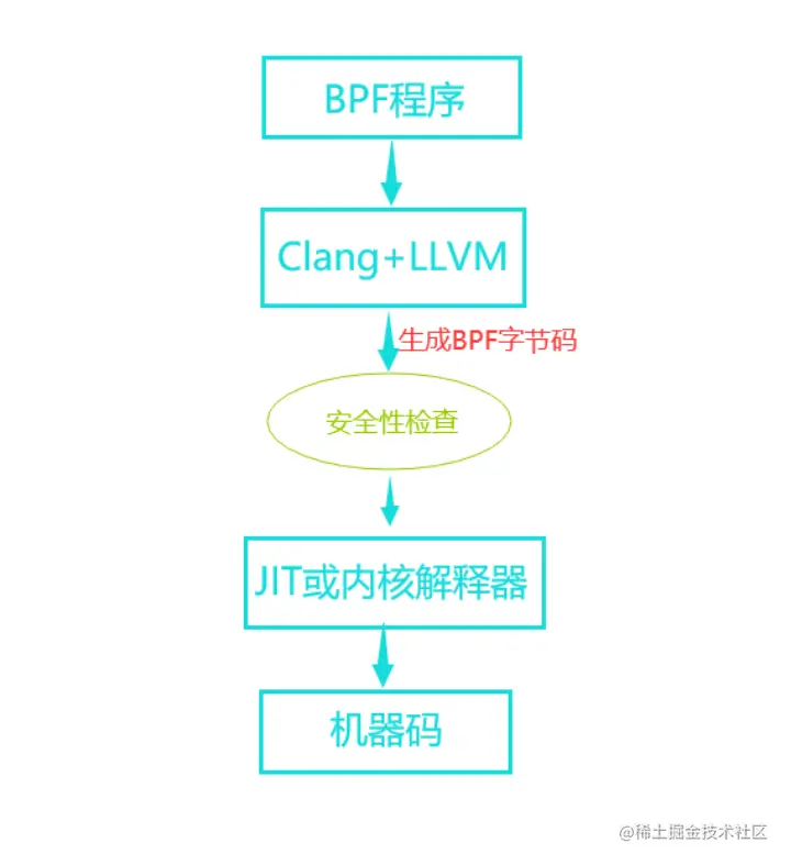 用户编写的eBPF程序代码将被编译为BPF 字节码,而字节码在运行之前会经过验证,以确保它不会带有循环(此前出于安全性考虑,eBPF不支持带有循环的附加程序代码,在Linux 5.3之后开始支持有限循环代码),此步骤可防止程序有意或无意地损害Linux 内核。
