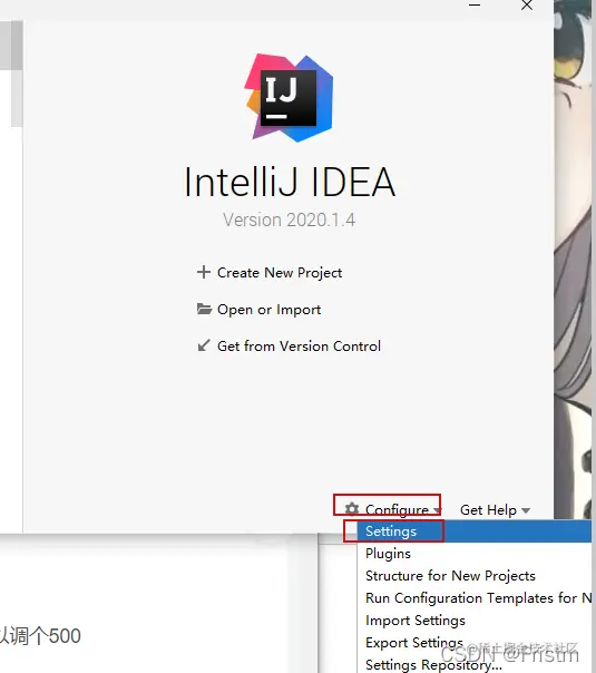 从我们的页面找到配置(configure)找到设置(settings)这是进行对你idea进行全局的配置,