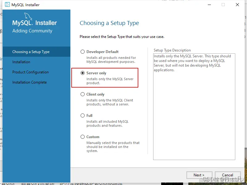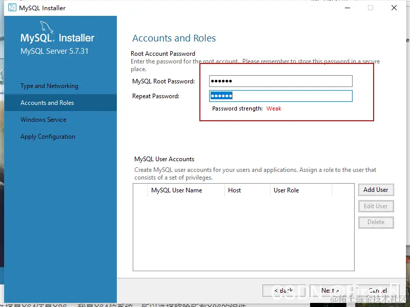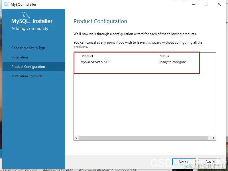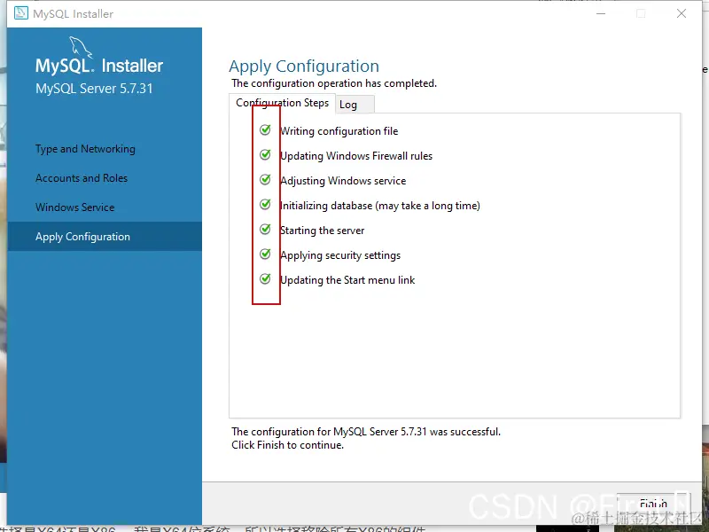 MySQL5.7.31安装配置(保姆教程) First 2022-03-23 129 阅读1分钟 1.我们打开MySQL安装包,选择自己需要的版本,我用的是5.7.31 选择适合自己的模式,然后Next 2.然后进入此页面他会下载这让后点击下一步 3.进入到此页面端口号默认是3306 4.第四步设置密码 5.最后一步点击安装,等绿色对号全部对上就安装好了