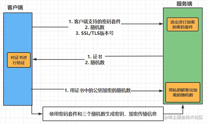 服务端收到客户端发送来的信息后,在客户端所支持的密码套件中选定合适的密码套件。后返回一个随机数和证书给客户端