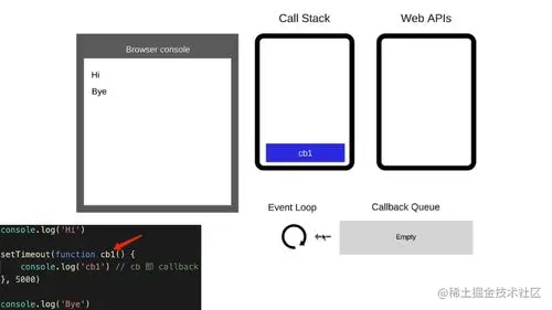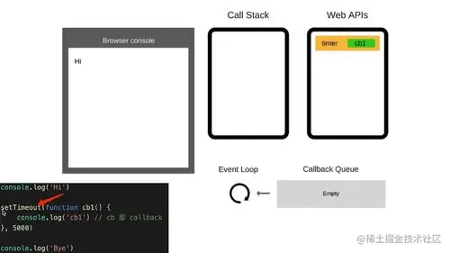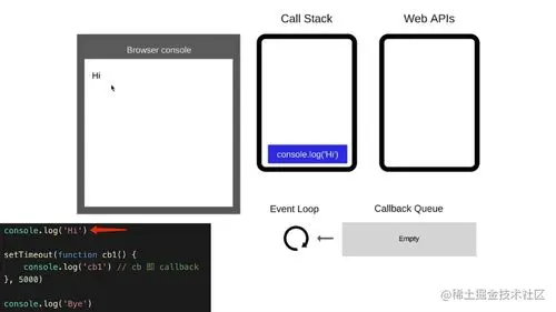 1. 将 console.log("Hi") 推入调用栈,调用栈会执行代码